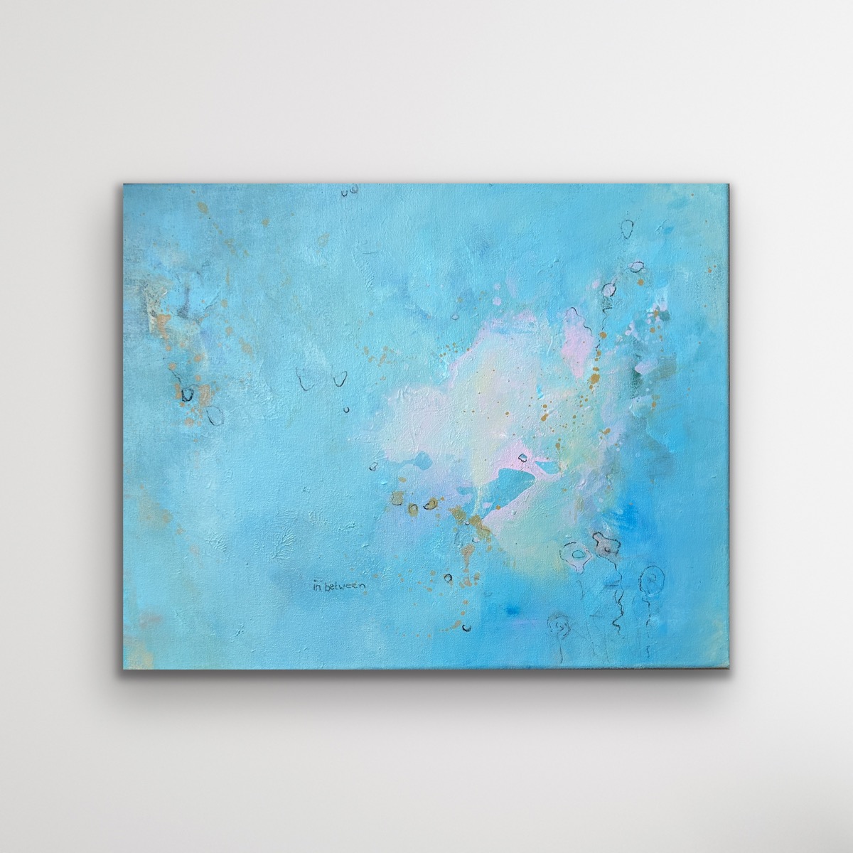 Die kühlen Blau- und Türkistöne schaffen Weite und Ruhe. Helle Farbflächen, feine Spuren und sanfte Übergänge lassen das Bild leicht wirken. Alles bleibt im Fluss, ohne sich zu verdichten.